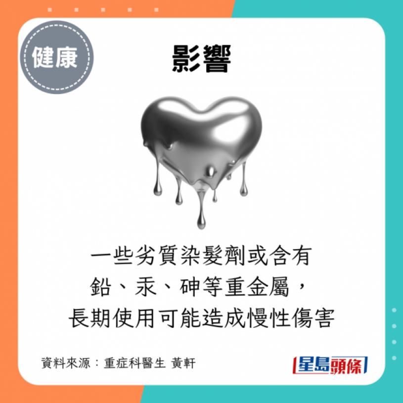 一些劣质染发剂或含有铅、汞、砷等重金属,长期使用可能对身体造成慢性伤害。