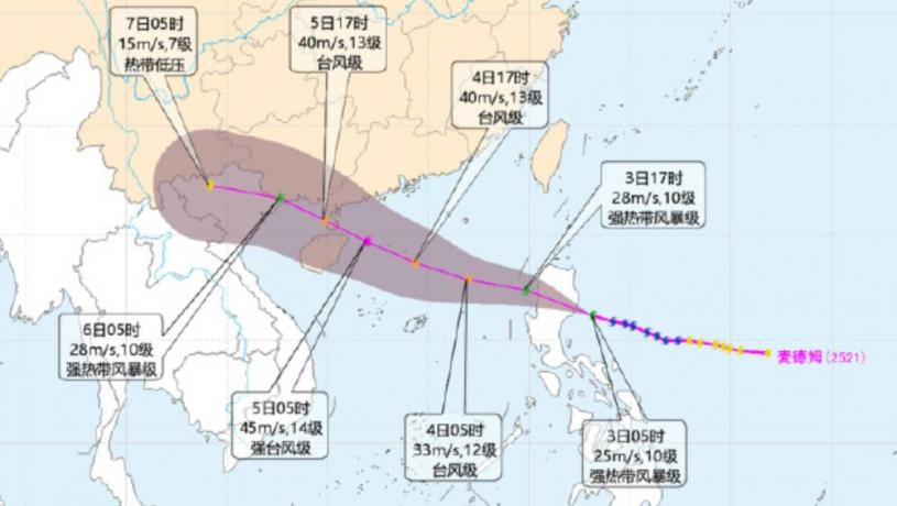 10月3日8時至4日8時,受「麥德姆」影響,巴士海峽、南海東北部和中東部將有6-8級大風、陣風9級,「麥德姆」中心經過的附近海域風力可達9-11級,陣風12-13級。