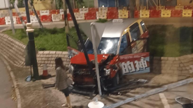 根據網上圖片所見,的士鏟過石壆後,撞毀燈柱及指示牌,車頭嚴重損毀,泵把鬆脫,零件散落一地。相中見到,的士左邊車門貼有「的神」兩字,前方則有一名女子,未知其身份。