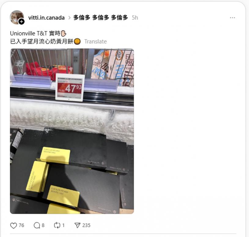 另一名網民則在今日中午12時到訪大統華Unionville分店,發現望月流心月餅六折發售,由原價79.88元減至47.93元,但貨量有限。