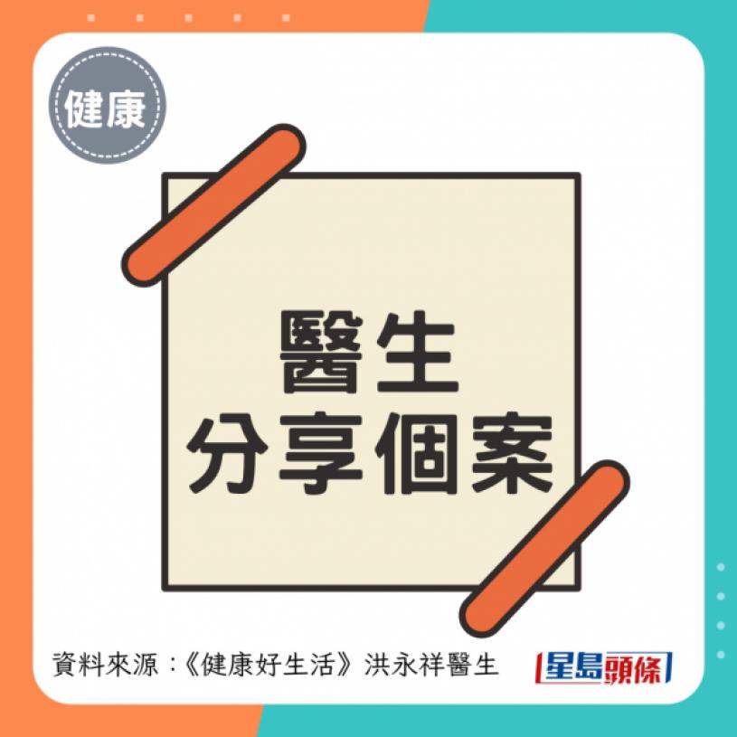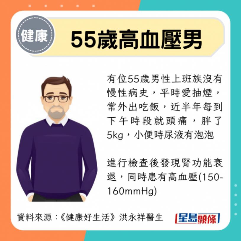 洪醫生指,該位55歲男患者沒有慢性病史,平時愛抽煙,常外出吃飯及吃外賣,近半年每到下午時段就頭痛,胖了5kg,小便時尿液有泡泡。進行抽血檢查後發現他的腎功能重要指標「腎絲球過濾率」僅60分,而同齡人一般會有80-90分,意味著腎功能衰退。同時亦發現他患有高血壓,其收縮壓在150-160mmHg(正常值在120mmHg以下),需要透過藥物治療。