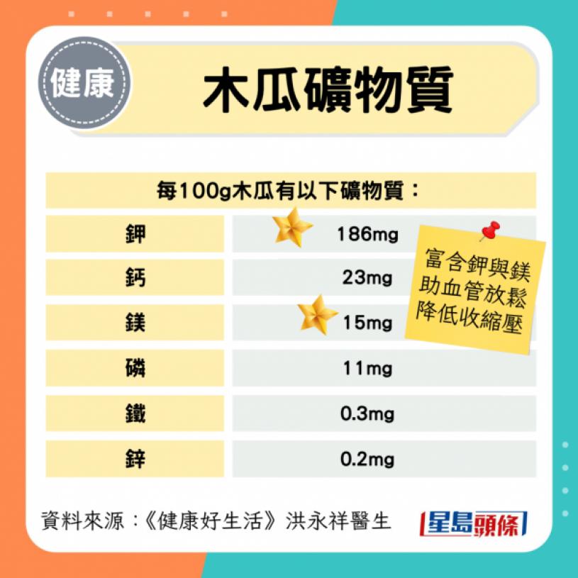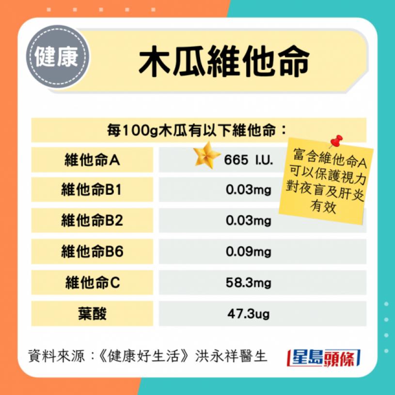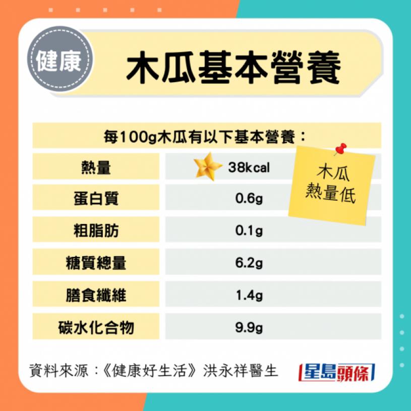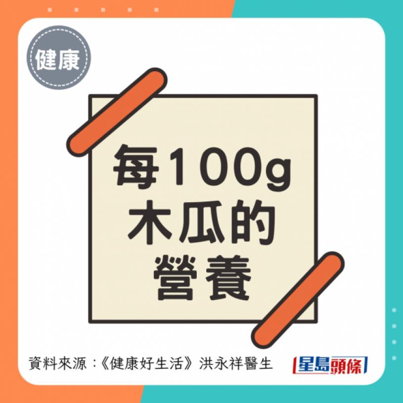 木瓜熱量低,每100g只有38kcal,同時富含維他命A,可以保護視力、對夜盲及肝炎有效。加上富含鉀與鎂,有助血管放鬆,可降低收縮壓,有代謝症候群或三高人士可以多吃木瓜。