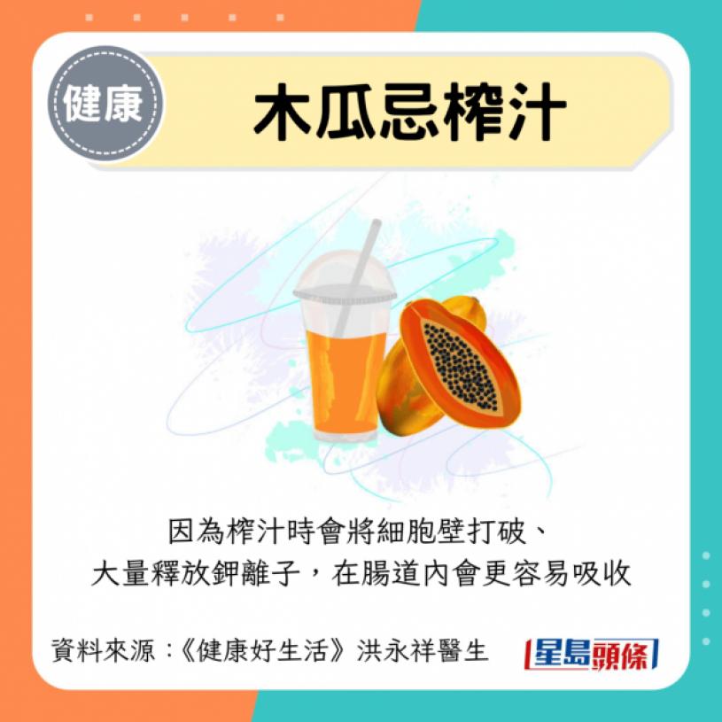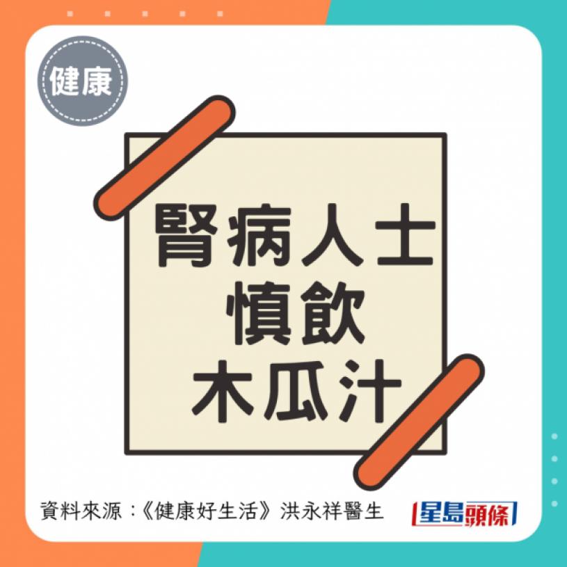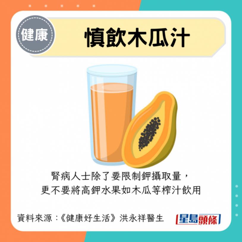 腎病人士除了要限制鉀攝取量,更不要將高鉀水果如木瓜等榨汁飲用,因為榨汁時會將細胞壁打破、大量釋放鉀離子,在腸道內會更容易吸收。另外,孕婦、對木瓜過敏、吃木瓜會肚瀉人士都要慎食。