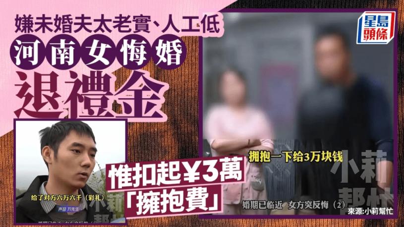 河南悔婚女嫌未來老公人工低 退禮金惟扣¥3萬「擁抱費」