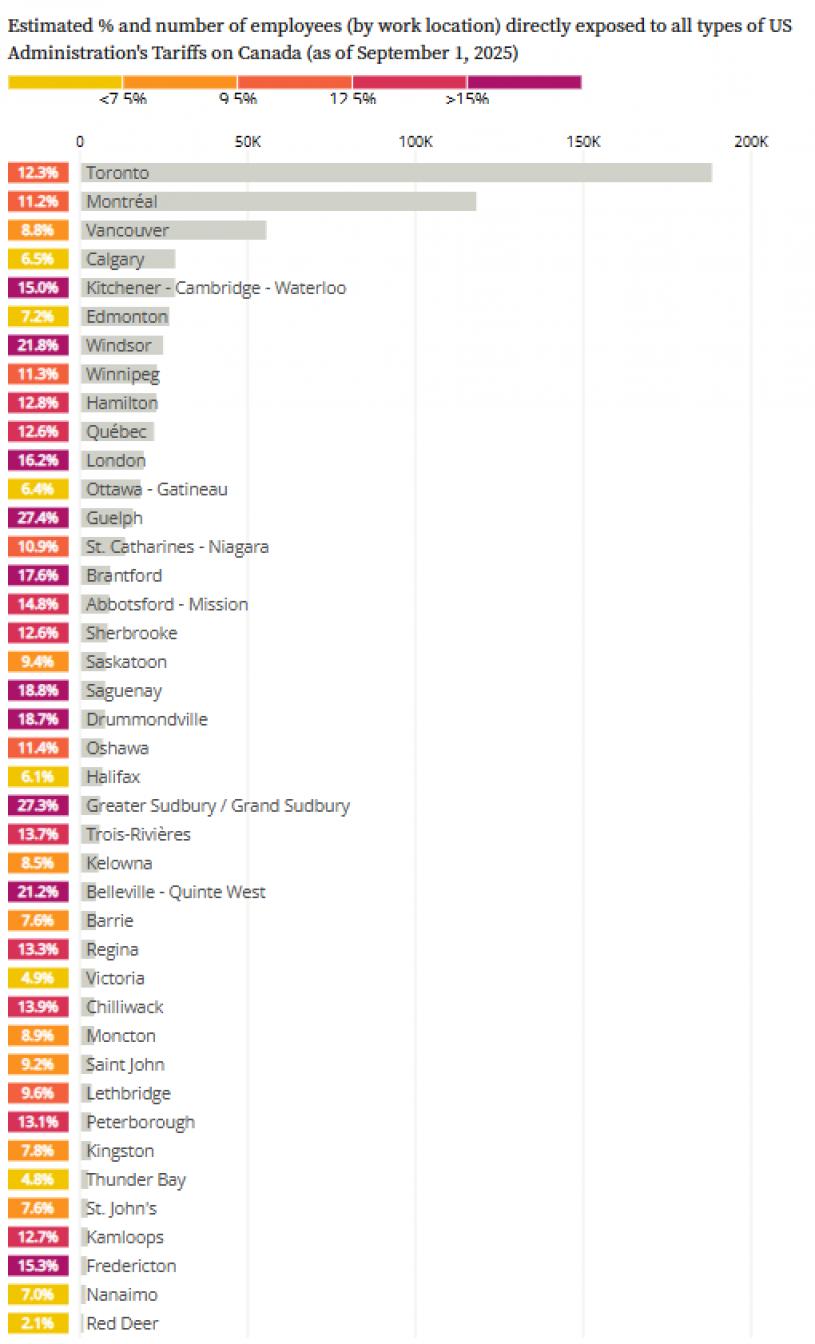 至于人数方面,多伦多以近25万潜在受影响工人位列全国第一,紧随其后的则是满地可、温哥华、卡加利及爱民顿。安省的咸美顿(Hamilton)、基秦拿–剑桥–滑铁卢(Kitchener - Cambridge – Waterloo)及渥太华-加蒂诺(Ottawa – Gatineau)亦上榜,每市约有5万名居民或受直接冲击。