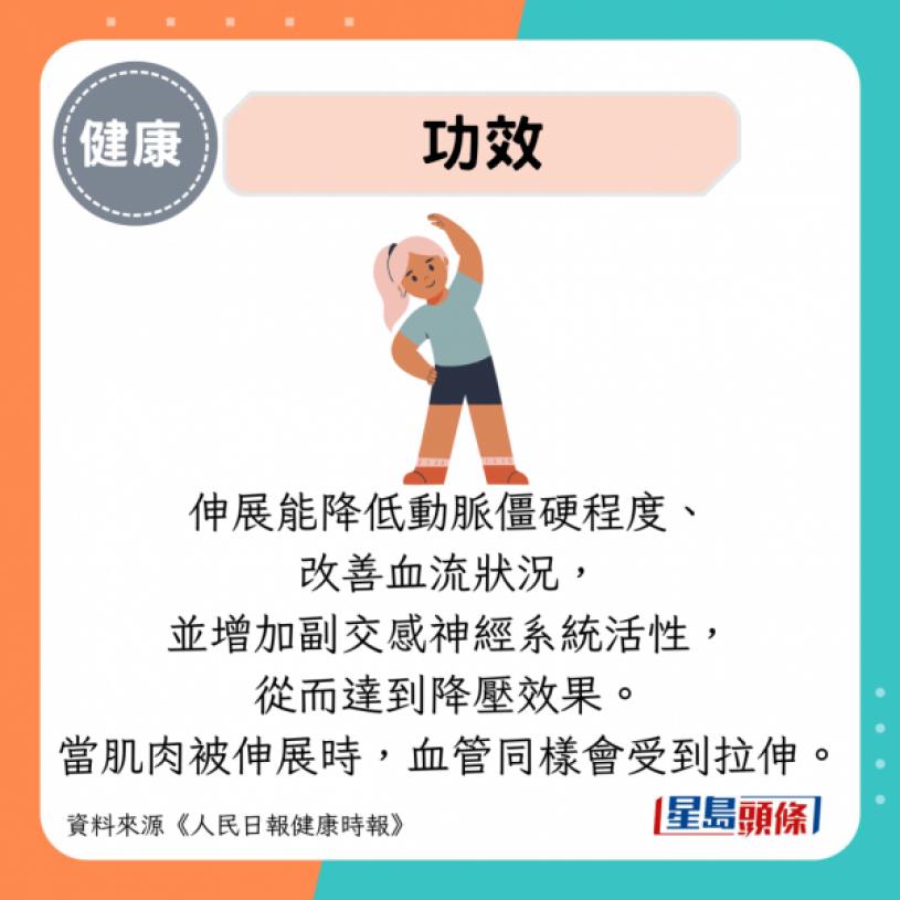 雖然有氧運動是被推薦的降血壓運動方式,但既往研究也證實,伸展能降低動脈僵硬程度、改善血流狀況,並增加副交感神經系統活性,從而達到降壓效果。當肌肉被伸展時,血管同樣會受到拉伸。