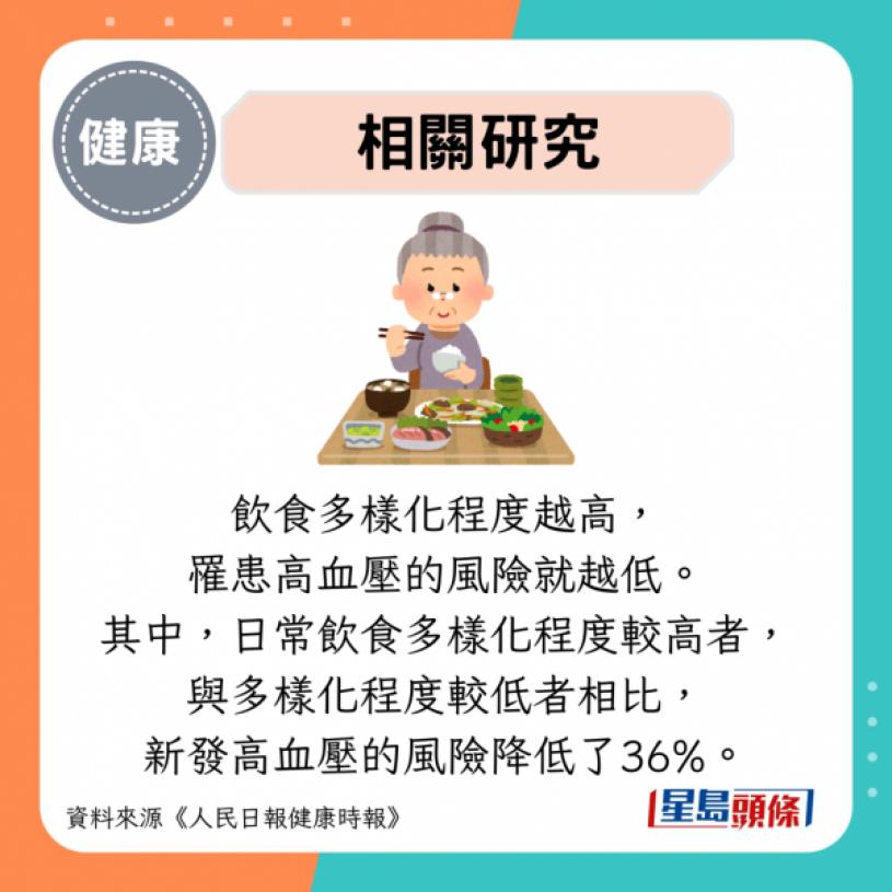 2024年發表在《Hypertension Research》一項研究發現,對中國成年人而言,飲食多樣化程度越高,罹患高血壓的風險就越低。其中,日常飲食多樣化程度較高者,與多樣化程度較低者相比,新發高血壓的風險降低了36%。