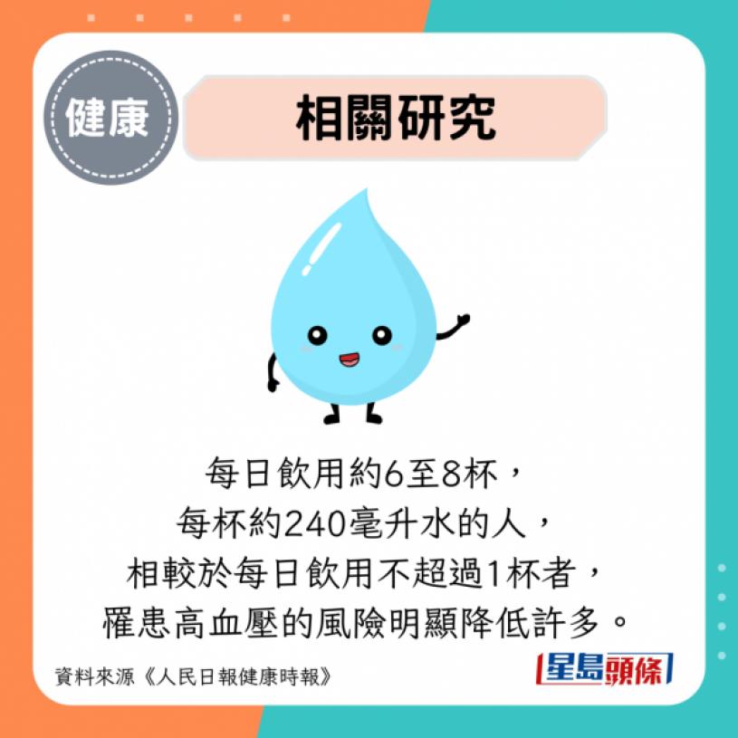 2024年刊登於《Frontiers in Public Health》的一項研究指出,每日飲用約6至8杯,每杯約240毫升水的人,相較於每日飲用不超過1杯者,罹患高血壓的風險明顯降低許多。