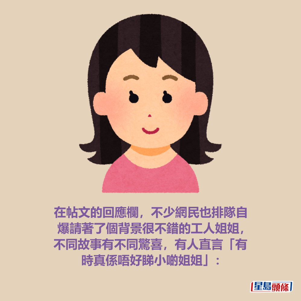 在帖文的回應欄,不少網民也排隊自爆請著了個背景很不錯的工人姐姐,不同故事有不同驚喜,有人直言「有時真係唔好睇小啲姐姐」: