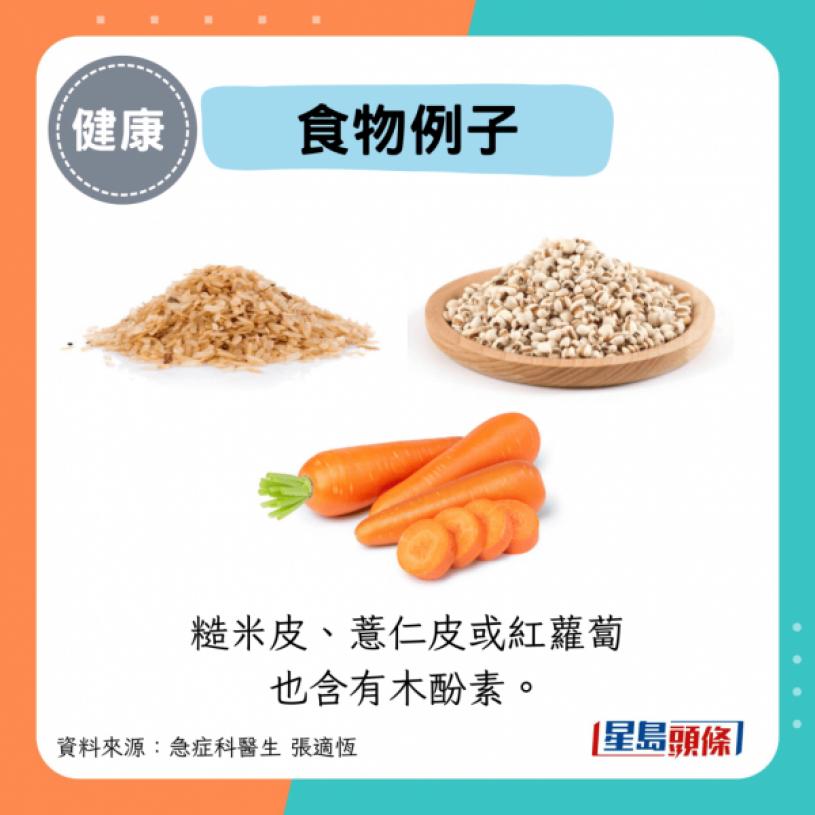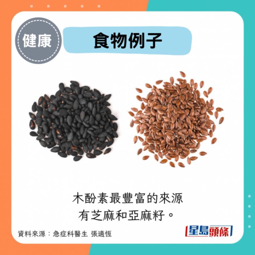 張適恆醫生指,木酚素屬於多酚化合物,這些多酚集中在種子、樹皮和樹脂中,通常可以從種子中獲取。木酚素最豐富的食物來源有芝麻和亞麻籽,而糙米皮、薏仁皮或紅蘿蔔也含有木酚素。過往有研究顯示,木酚素具有抗氧化、抗發炎和抗腫瘤的特性,對降低患乳癌風險具有正面影響。