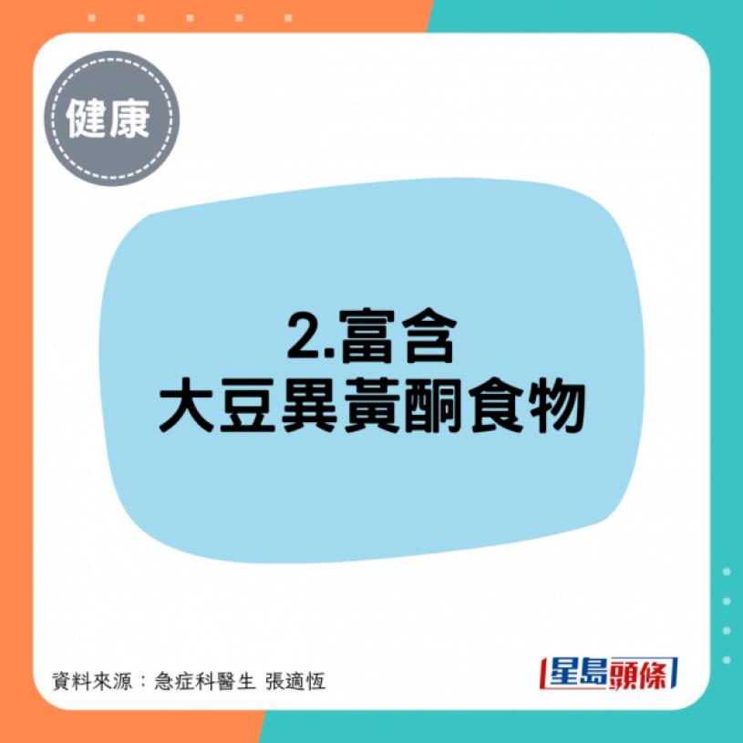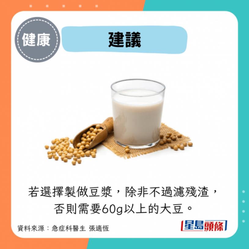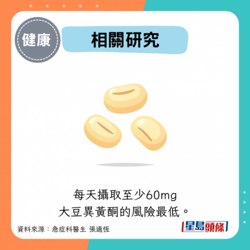 對於每日攝取60毫克大豆異黃酮的方法,張適恆醫生表示,1克大豆大約含有1毫克大豆異黃酮,若要攝取60mg大豆異黃酮,則需要每日食用60克大豆。另外,若選擇把大豆製做豆漿、豆乾和豆腐花等,由於這類大豆製品的加工程序較多,當中含有的大豆異黃酮含量會較少,盡量不要作為攝取大豆異黃酮第一選擇。