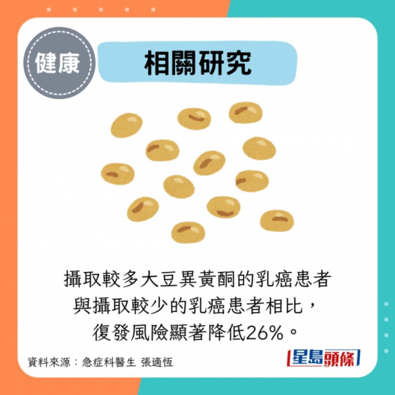 張適恆醫生表示,乳癌患者透過進食大豆製品,攝取當中的大豆異黃酮,不但不會令乳癌惡化,甚至還可降低乳癌的復發風險,乳腺細胞會因為大豆異黃酮而獲得保護,某程度上亦可降低患乳癌風險。