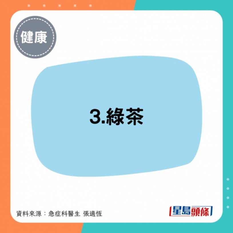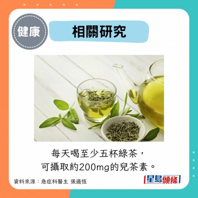 張適恆醫生提醒,一杯240cc的綠茶含有約30毫克的咖啡因,若喝5杯相當於攝取150毫克的咖啡因。雖然低於每天300毫克至400毫克咖啡因的攝取量,但對咖啡因敏感或容易失眠的人需要留意飲用量。此外,如果喝綠茶容易出現心悸、腸胃不適或有缺鐵性貧血人士,也需要限制綠茶攝取量。