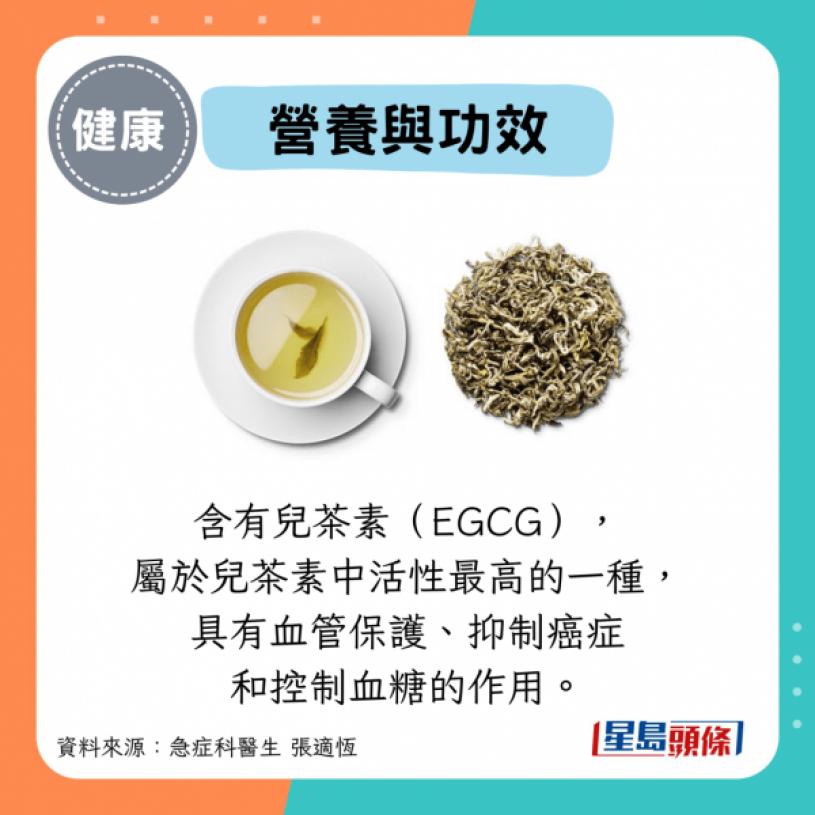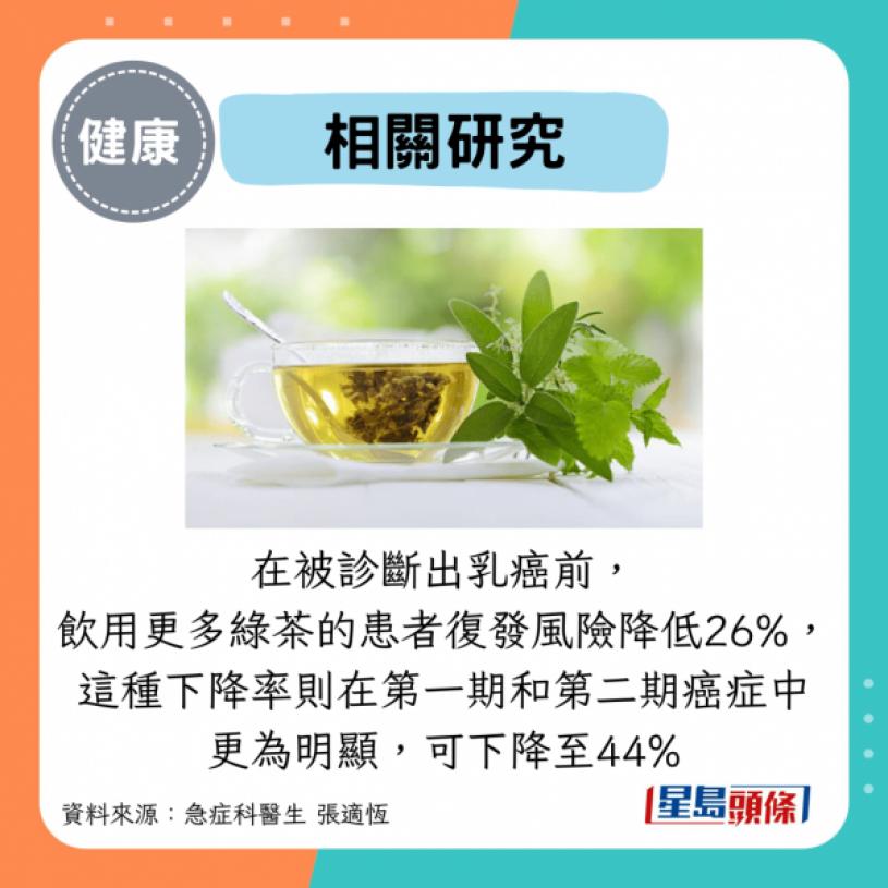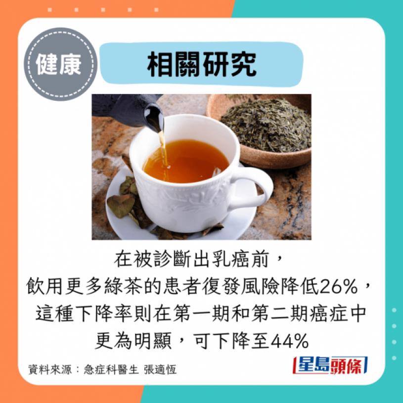 張適恆醫指,綠茶含有兒茶素(EGCG),屬於兒茶素中活性最高的一種,具有血管保護、抑制癌症和控制血糖的作用,因此常喝綠茶亦可降低患上乳癌的風險。