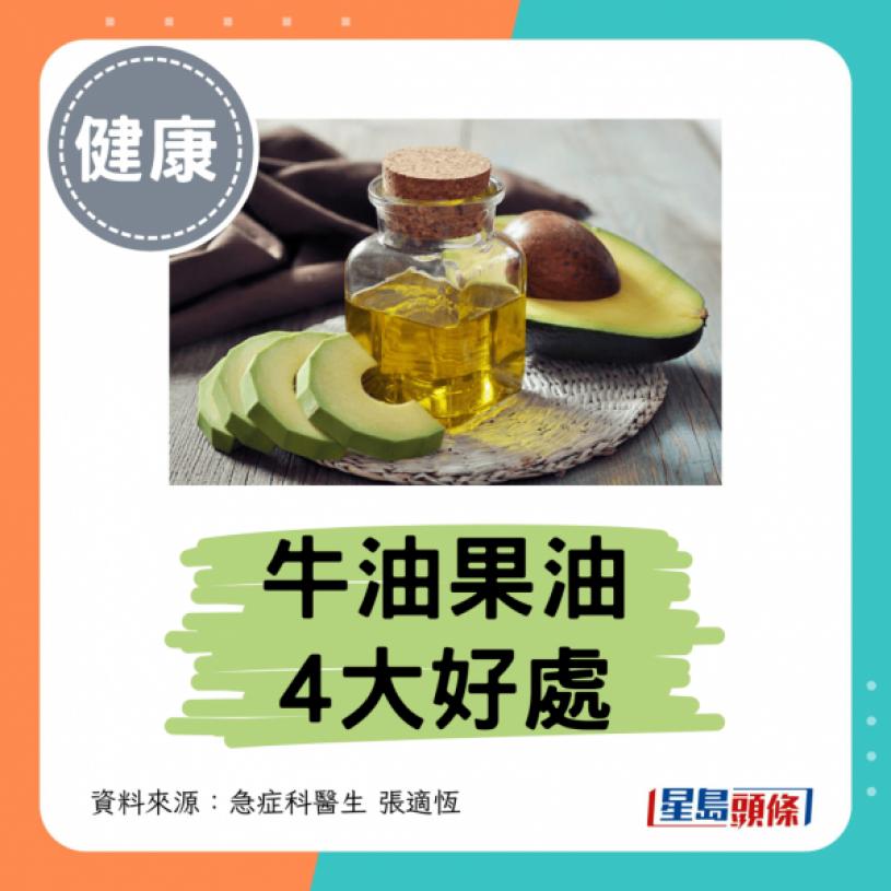 張適恆醫生表示,雖然牛油果油缺乏像橄欖油的長期研究,但由於兩者的組成非常類似。因此長期食用牛油果油,相信可以獲得與橄欖油一樣的健康效益。牛油果油有以下4大好處: