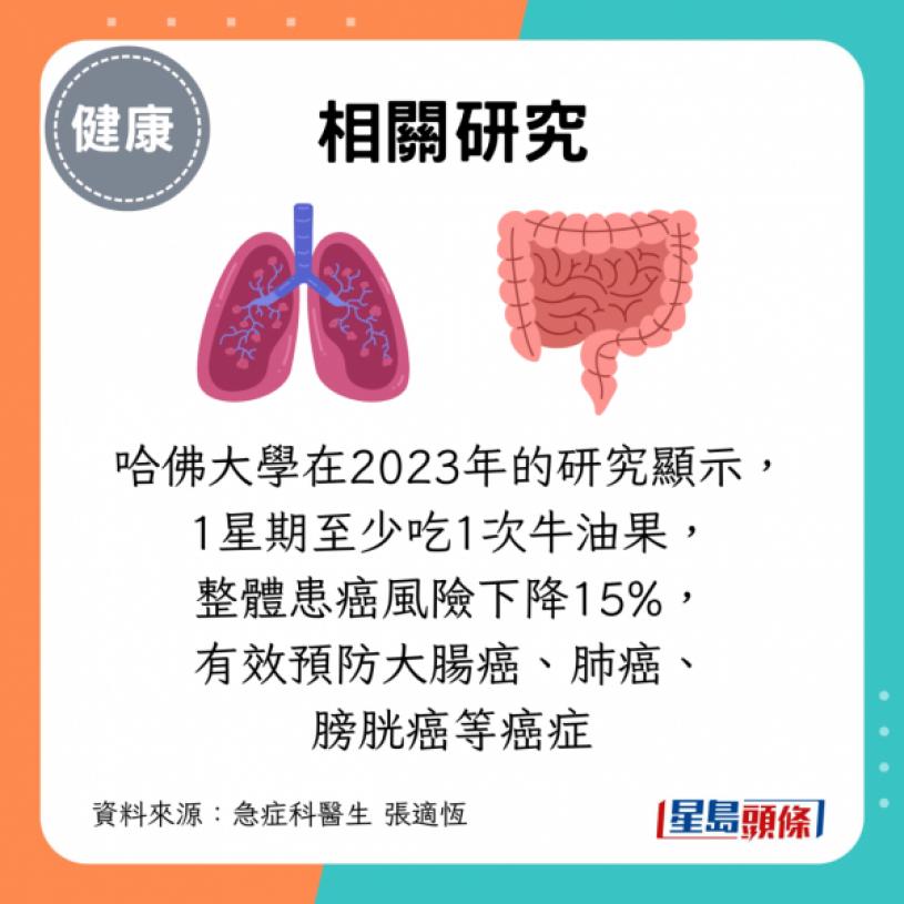 哈佛大學在2023年發表研究顯示,1星期至少吃1次牛油果,整體患癌風險下降15%,有效預防大腸癌、肺癌、膀胱癌等癌症。