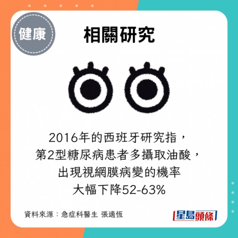 2016年的一項西班牙研究指,第2型糖尿病患者多攝取油酸,出現視網膜病變的機率大幅下降52至63%。