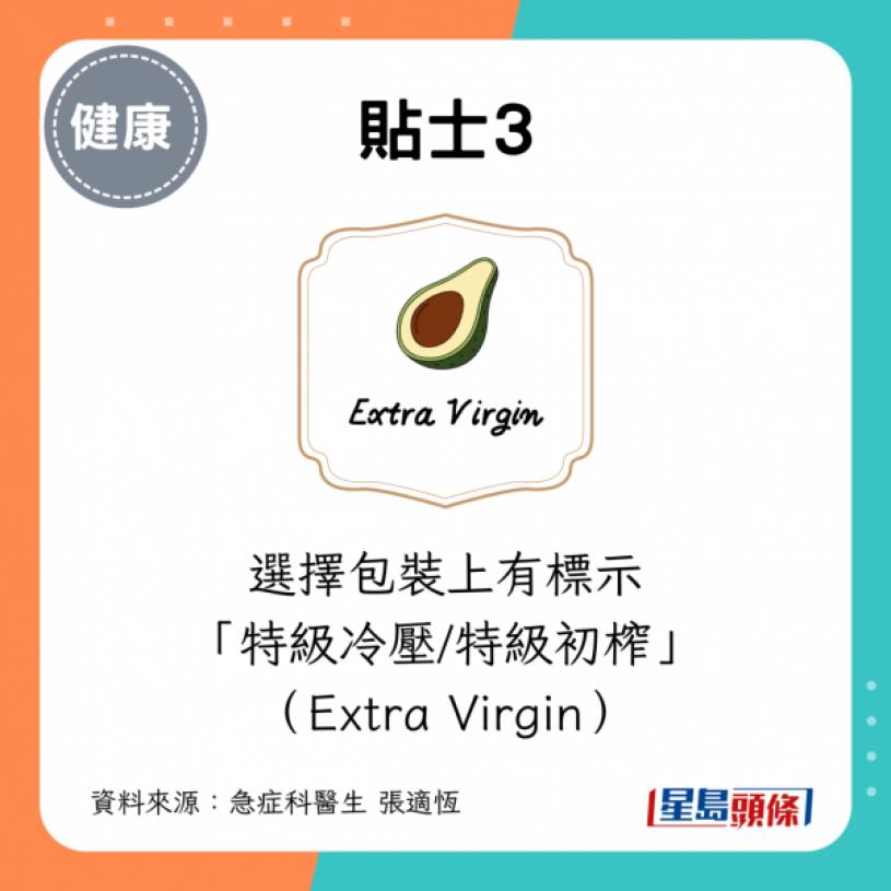 - 選擇包裝上有標示「特級冷壓/特級初榨(Extra Virgin)」。如果沒有標示「Virgin」,很可能是機械壓榨甚至是溶劑萃取。機械壓榨過程溫度較高,令油品酸價提高;溶劑萃取則會去除掉很多營養成分。