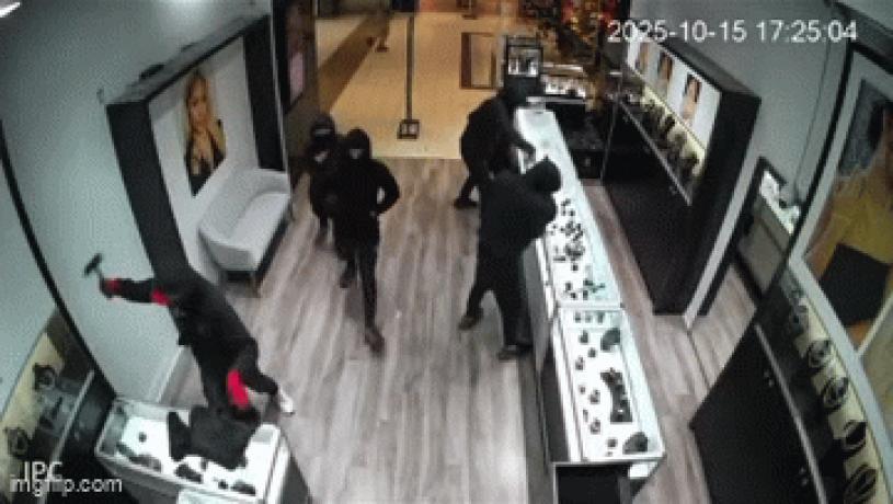 用户 @401_da_sarpanch 在X上載該珠寶店的閉路電視片段,片中五人闖入珠寶店後持槌子打爆櫥窗,掃走展示櫃的珠寶後途去。