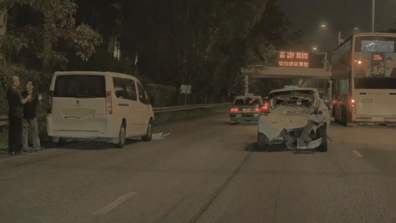 現場所見,私家車車尾嚴重損毀,尤如廢鐵,客貨車則停在路肩。