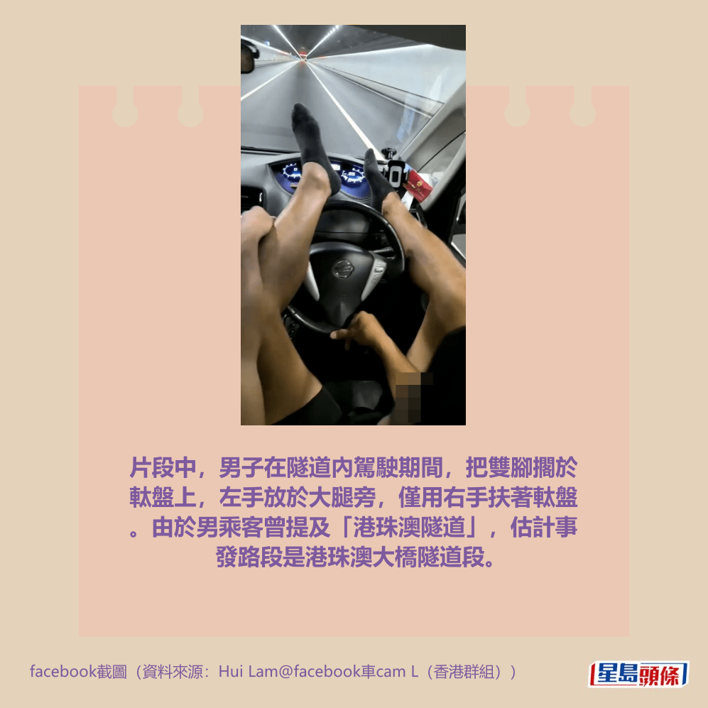 片段中,男子在隧道內駕駛期間,把雙腳擱於軚盤上,左手放於大腿旁,僅用右手扶著軚盤。由於男乘客曾提及「港珠澳隧道」,估計事發路段是港珠澳大橋隧道段。
