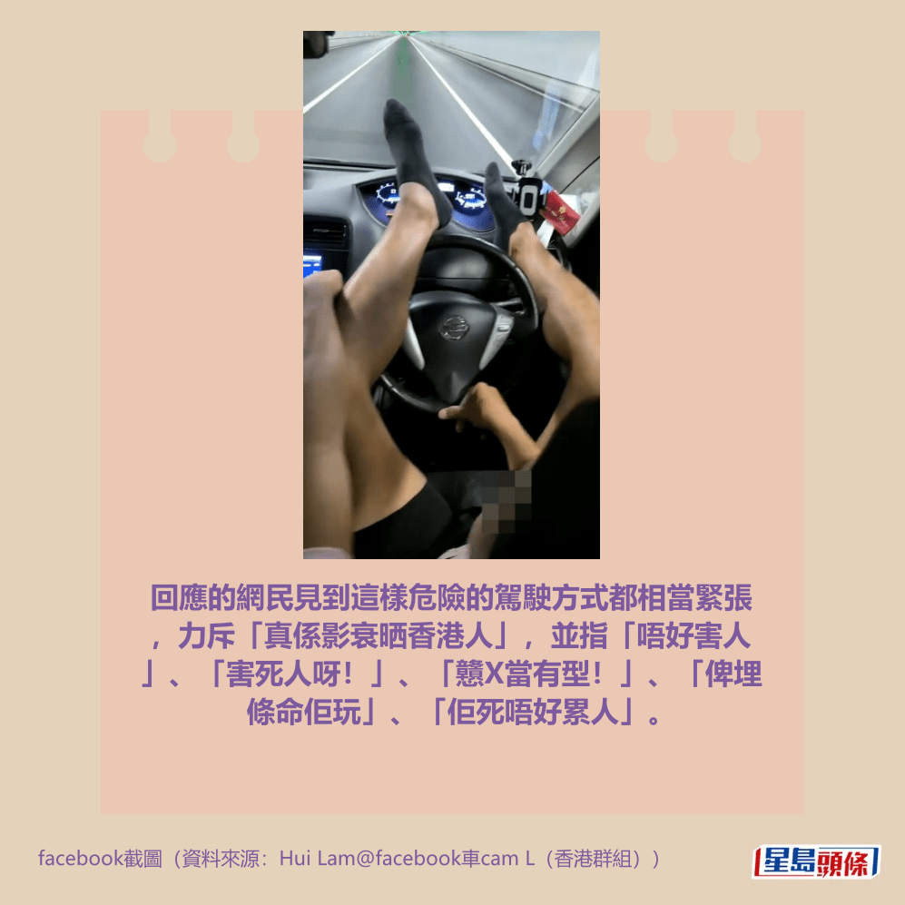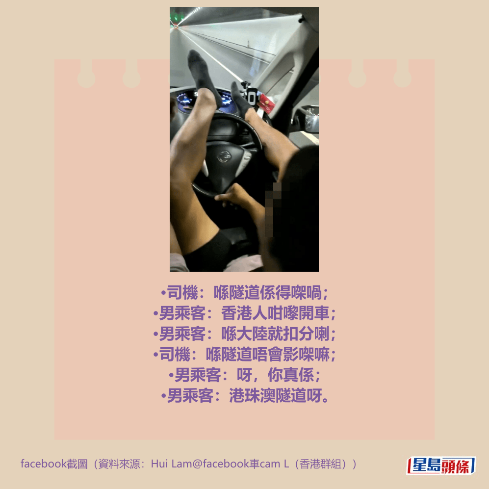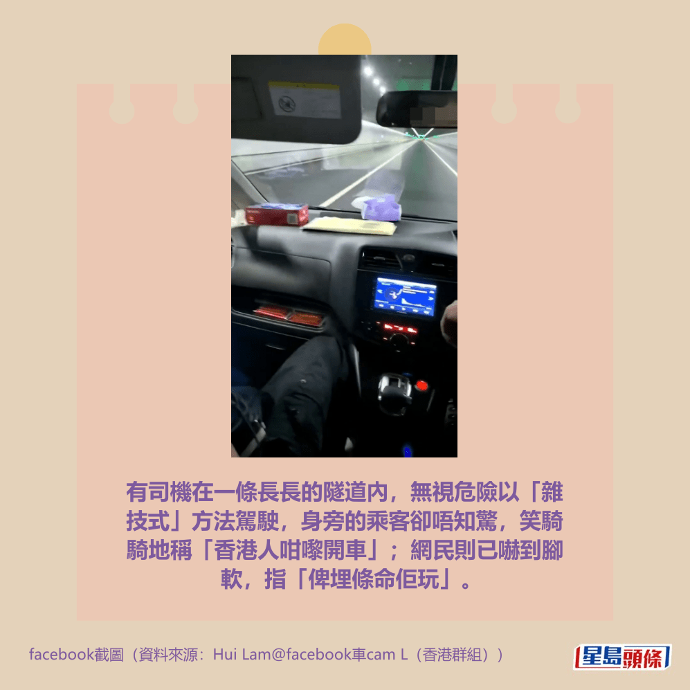 有司機在一條長長的隧道內,無視危險以「雜技式」方法駕駛,身旁的乘客卻唔知驚,笑騎騎地稱「香港人咁嚟開車」;網民則已嚇到腳軟,指「俾埋條命佢玩」。詳情見下圖及下文:
