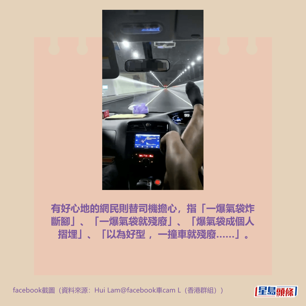有好心地的網民則替司機擔心,指「一爆氣袋炸斷腳」、「一爆氣袋就殘廢」、「爆氣袋成個人摺埋」、「以為好型 ,一撞車就殘廢……」。