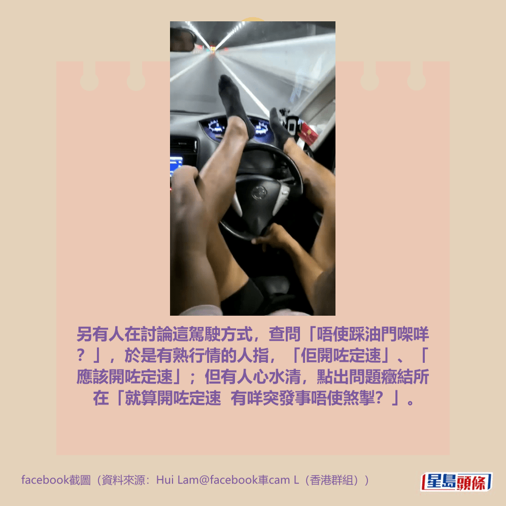 另有人在討論這駕駛方式,查問「唔使踩油門㗎咩?」,於是有熟行情的人指,「佢開咗定速」、「應該開咗定速」;但有人心水清,點出問題癥結所在「就算開咗定速 有咩突發事唔使煞掣?」。
