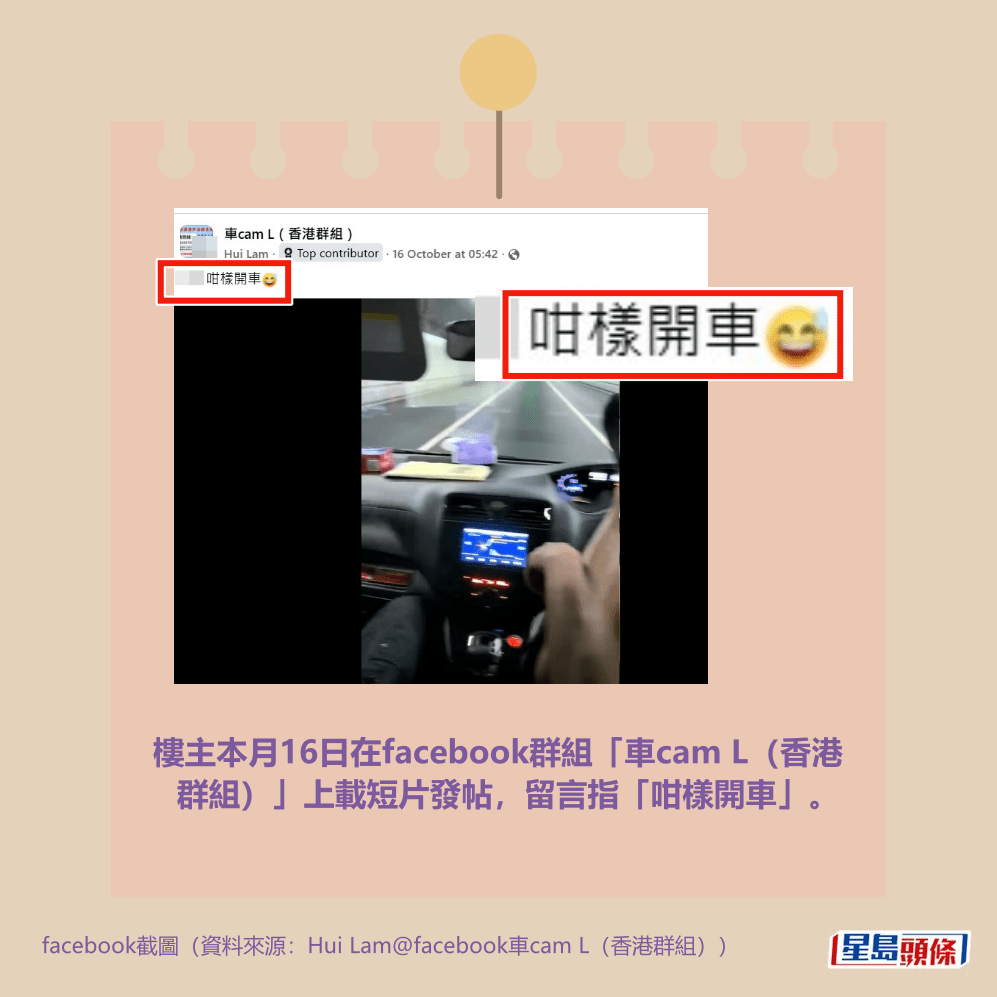 樓主本月16日在facebook群組「車cam L(香港群組)」上載短片發帖,留言指「咁樣開車」。短片長約12秒,根據車上的愉快對答聲音,連同司機應至少有2男1女。片中的對答如下: