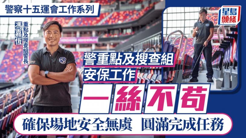 距離第十五屆全國運動會開幕不足一個月,警隊的籌備工作進入最後階段,重點及搜查組早前擬定各場館的搜查策略及安檢計劃,將於開幕前派出警察搜查隊人員,在啟德體育園、香港單車館等場館進行滴水不漏的搜查工作。重點及搜查組警長馮嘉恆表示,會針對各場館特性調配人手及工具,排除所有潛在威脅,並協助設置安檢站及舉辦訓練課程,全面提升相關人員反恐及安保能力,確保賽事安全順利舉行。