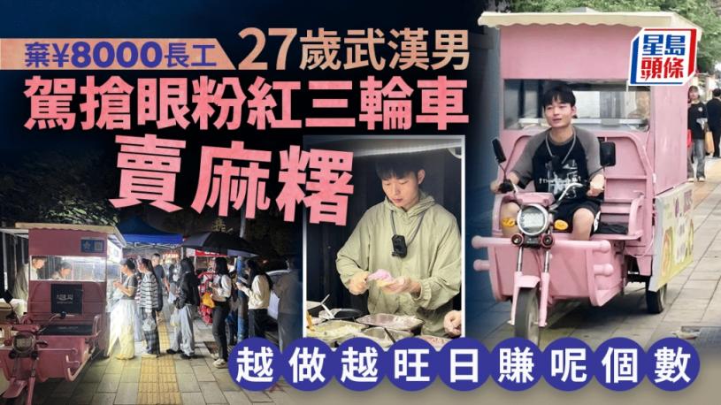 湖北武漢,27歲張姓男子放棄在寧波的穩定銷售工作,毅然轉行到夜市擺攤賣麻糬(港稱糯米糍)。為了讓攤位更具辨識度,他特別訂製一輛粉紅色三輪攤車。如今,他的生意越做越好,每日收入突破1000元(人民幣,下同),家人也從一開始反對轉為支持,更一同加入「擺攤小隊」。
