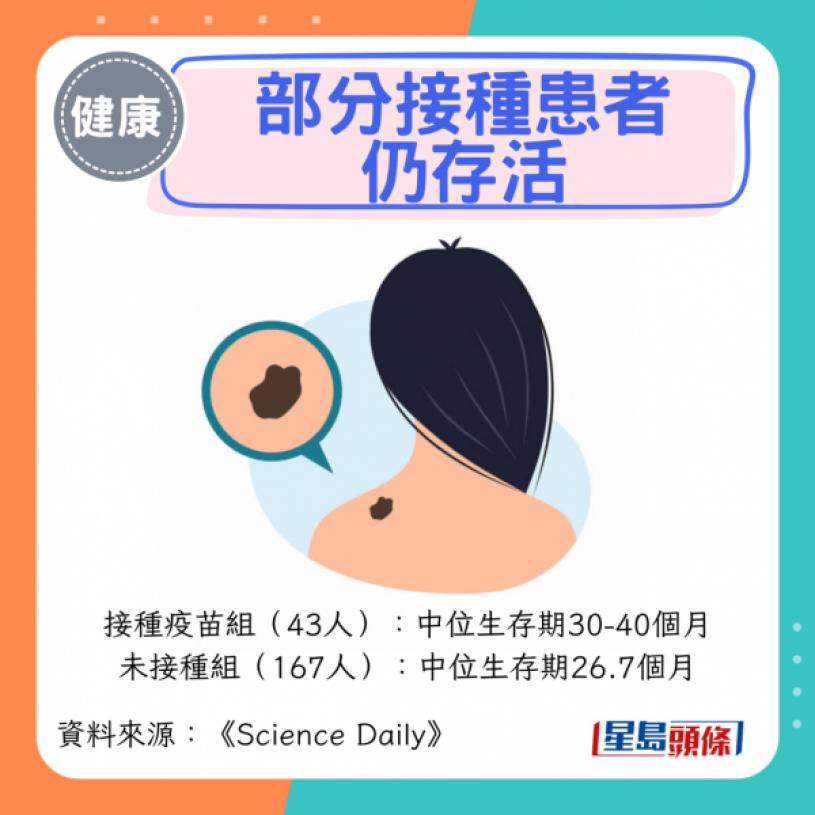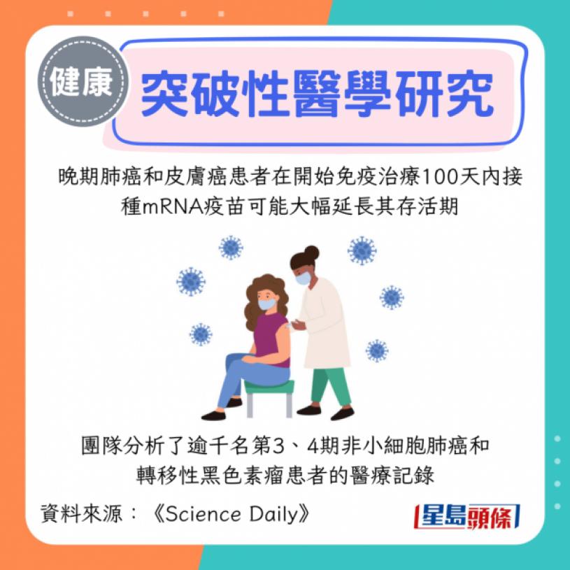 【癌症/防癌/疫苗】新冠mRNA疫苗可為癌症患者續命?美國近日一項新研究發現,晚期肺癌和皮膚癌患者在開始免疫治療100天內接種mRNA疫苗可能大幅延長其存活期,其中肺癌患者中位生存期更從20.6個月延長至37.3個月,壽命比未接種疫苗的患者顯著延長近一倍。