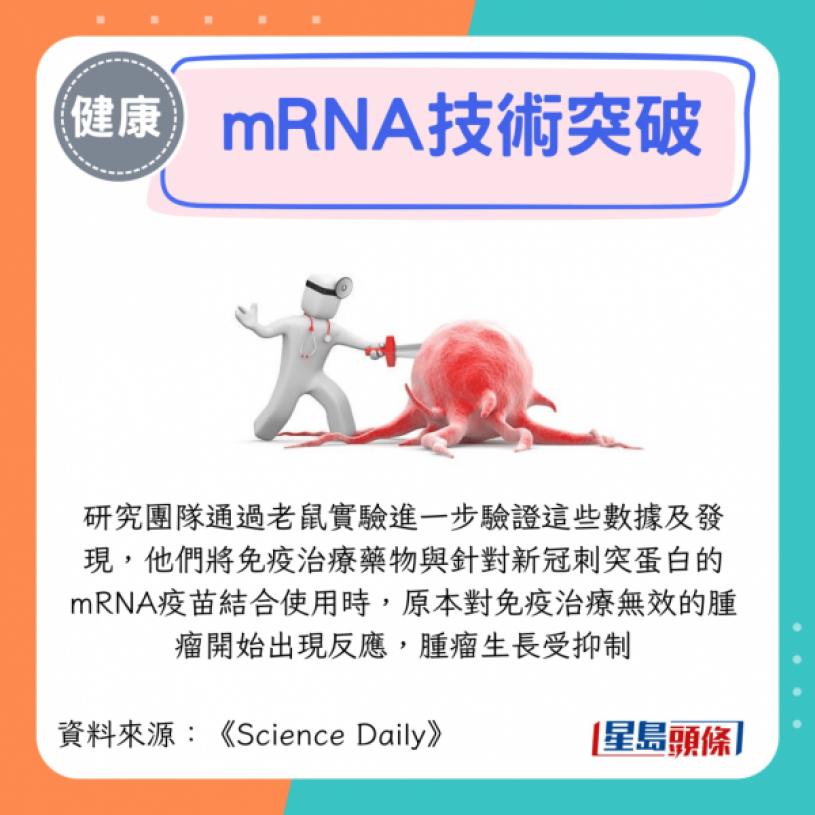 值得留意的是,接種非mRNA肺炎或流感疫苗的患者,並無發現壽命延長。研究團隊通過老鼠實驗進一步驗證這些數據及發現,他們將免疫治療藥物與針對新冠刺突蛋白的mRNA疫苗結合使用時,原本對免疫治療無效的腫瘤開始出現反應,腫瘤生長受抑制。該研究領導者、兒童腫瘤專家Elias Sayour教授解釋:「mRNA疫苗就像一個信號彈,將免疫細胞從腫瘤等不良區域轉移到淋巴結等良好區域。」