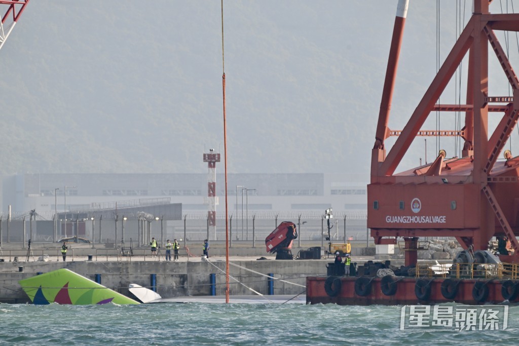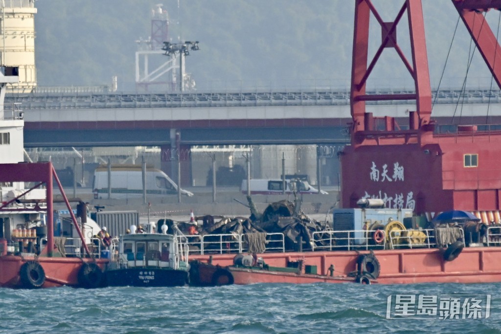 今晨《星島頭條網》記者出海觀察,發現打撈船「南天翔」及「南天鵬」、拖船「穗救拖18」均已在場,並駛近貨機殘骸,開始吊起疑引擎的機件。岸邊則有多名工作人員穿上反光衣戒備及監察。直至下午4時半,打撈工作仍在進行中,在打撈船南天翔的甲板上清晰可見有大量機件殘骸。