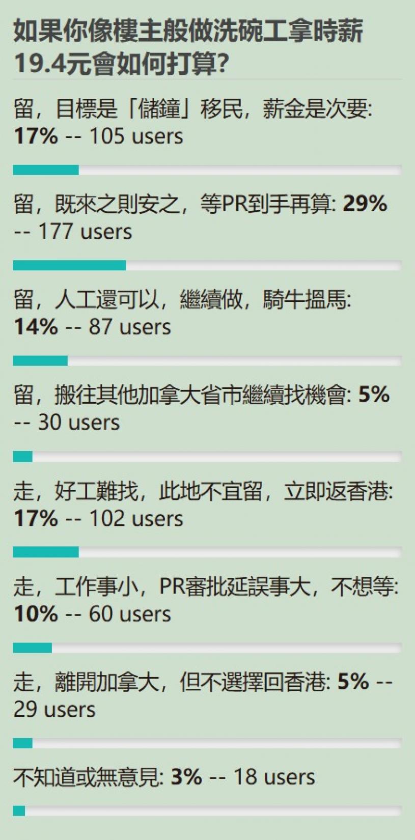 上述有意明年初回港的楼主说“今时今日大机会沉船”,似乎是因拿PR问题而萌生去意;并称自己英文差、学历普通、工作经验浅,在港时日间做文职、晚上做餐厅,所以并不介意做什么工种;还指在温哥华打工,时薪有最低工资另加1.5元小费(即约19.35元),辛勤工作下,身家由3,900加元暴增至25,000加元,因此“可以话真系储到几多钱”,并强调“加拿大冇欠过我”。