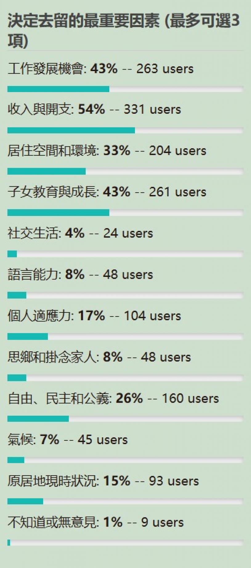 在“决定去留的最重要因素”中,“收入与开支”高居榜首(54%),“工作发展机会”和“子女教育与成长”(同为43%) 并列第二位,可见经济现实与下一代前景是主导因素。