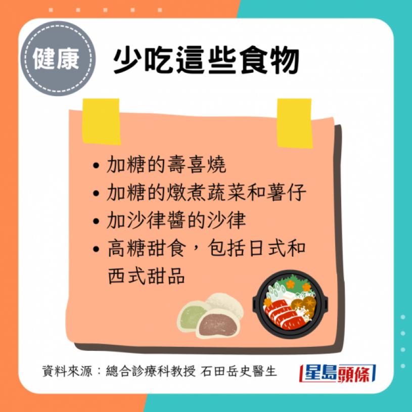 日式料理常使用糖提升滋味,例如壽喜燒。其糖分熱量高,容易導致肥胖,並增加罹患糖尿病之風險。燉煮蔬菜和薯仔時加糖,或者吃沙律時加入由大量油和糖製成的沙律醬,反而對身體無益。另外,踏入中年後避免吃高糖甜食,包括日式和西式甜品,包括大福、雪糕、忌廉蛋糕、餅乾等。