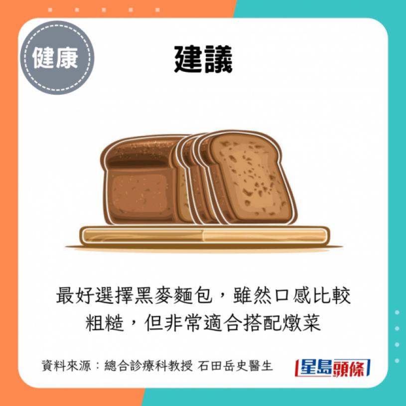 日式麵包好吃的原因是含鹽糖量很高,還加入大量牛油甚至人造牛油。人造牛油含有反式脂肪,會增加血液中的壞膽固醇,是導致血管老化的原因之一。日式的甜麵包、白麵包都要少吃。如果要吃麵包,最好選擇黑麥麵包,雖然口感比較粗糙,但非常適合搭配燉菜。
