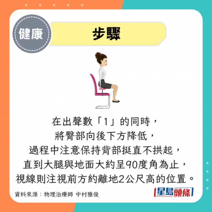 - 在出聲數「1」的同時,將臀部向後下方降低,過程中注意保持背部挺直不拱起,直到大腿與地面大約呈90度角為止,視線則注視前方約離地2公尺高的位置。