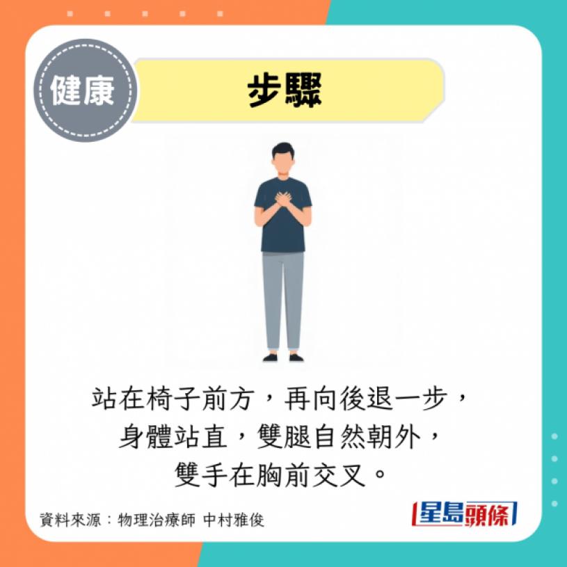 - 站在椅子前方,再向後退一步,身體站直,雙腿自然朝外,雙手在胸前交叉。