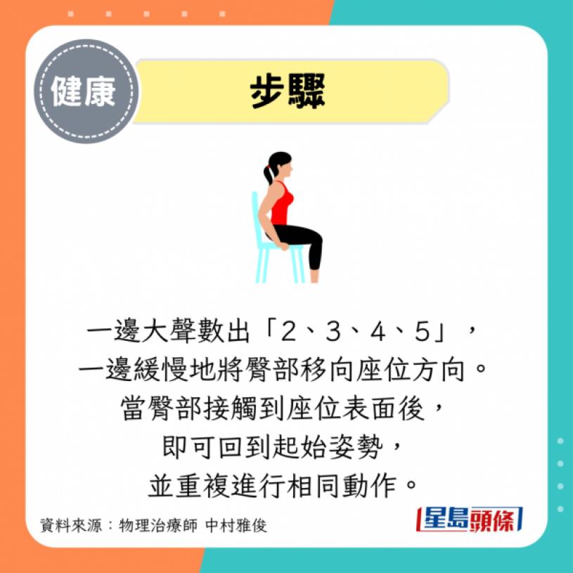 - 一邊大聲數出「2、3、4、5」,一邊緩慢地將臀部移向座位方向。當臀部接觸到座位表面後,即可回到起始姿勢,並重複進行相同動作。