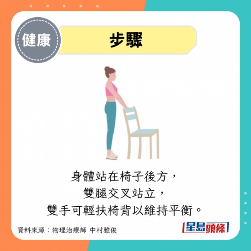 - 身體站在椅子後方,雙腿交叉站立,雙手可輕扶椅背以維持平衡。