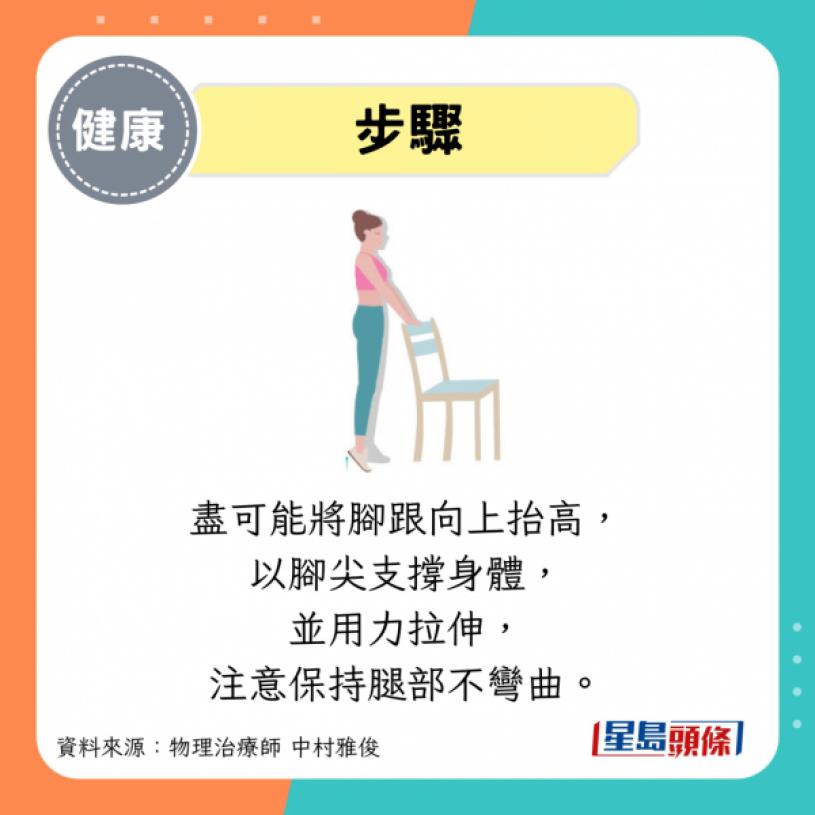 - 盡可能將腳跟向上抬高,以腳尖支撐身體,並用力拉伸,注意保持腿部不彎曲。