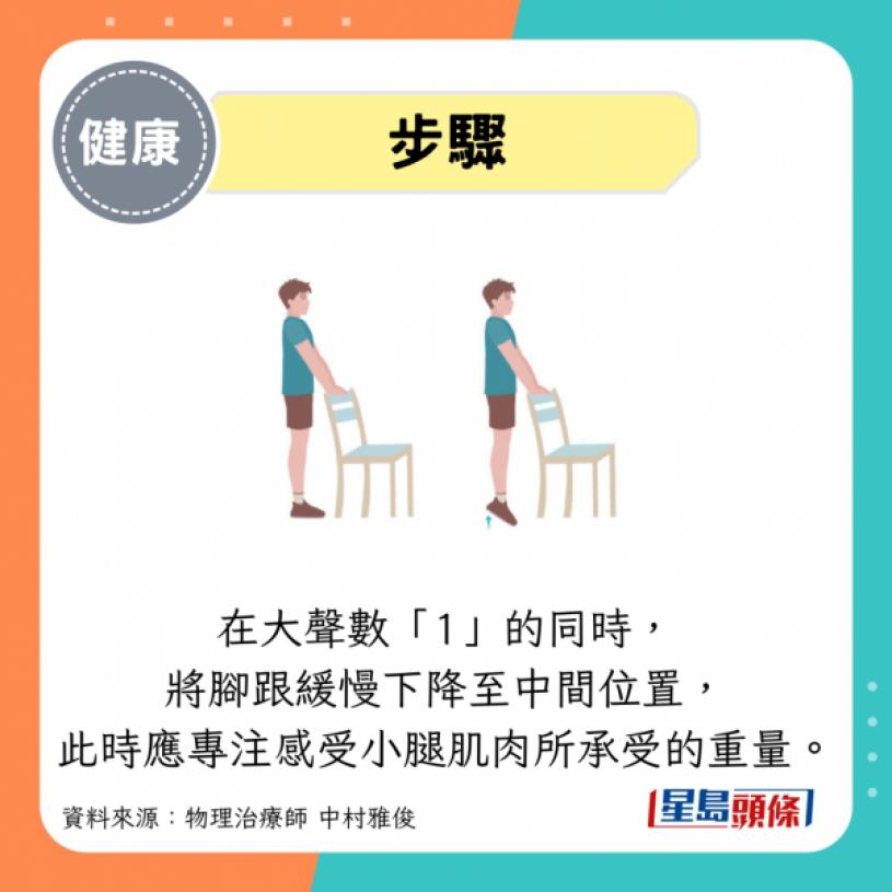 - 在大聲數「1」的同時,將腳跟緩慢下降至中間位置,此時應專注感受小腿肌肉所承受的重量。