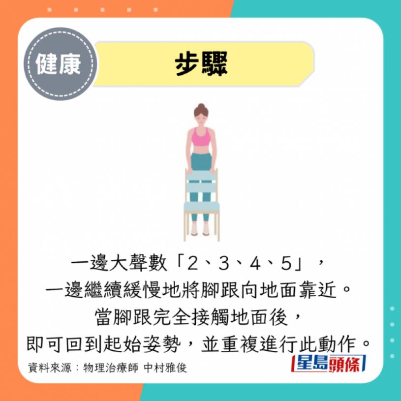 - 一邊大聲數「2、3、4、5」,一邊繼續緩慢地將腳跟向地面靠近。當腳跟完全接觸地面後,即可回到起始姿勢,並重複進行此動作。