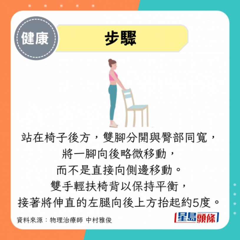 - 站在椅子後方,雙腳分開與臀部同寬,將一腳向後略微移動,而不是直接向側邊移動。雙手輕扶椅背以保持平衡,接著將伸直的左腿向後上方抬起約5度。