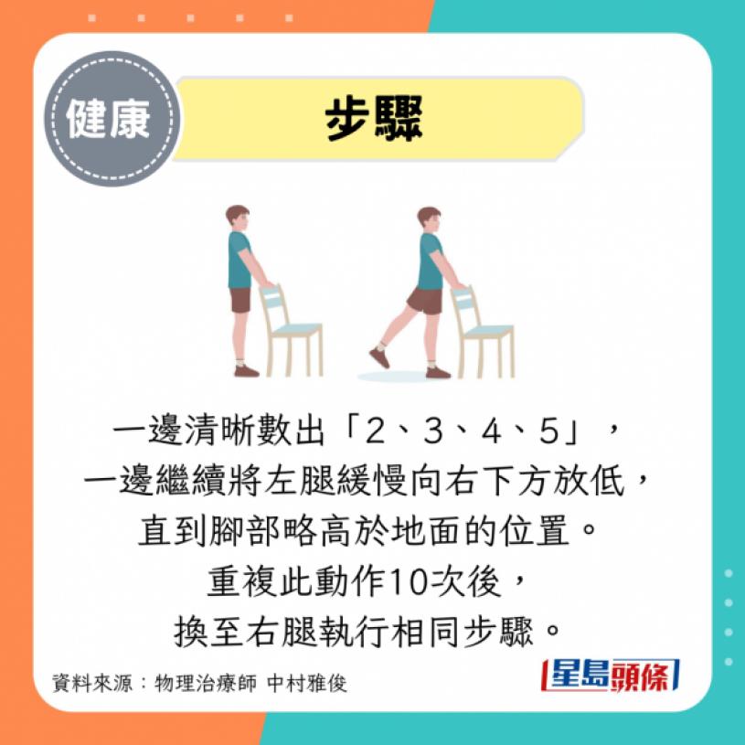 - 一邊清晰數出「2、3、4、5」,一邊繼續將左腿緩慢向右下方放低,直到腳部略高於地面的位置。重複此動作10次後,換至右腿執行相同步驟。