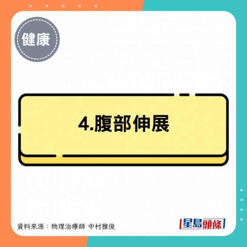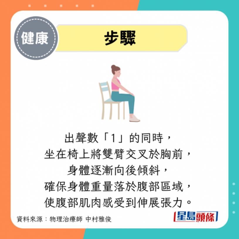 - 出聲數「1」的同時,坐在椅上將雙臂交叉於胸前,身體逐漸向後傾斜,確保身體重量落於腹部區域,使腹部肌肉感受到伸展張力。