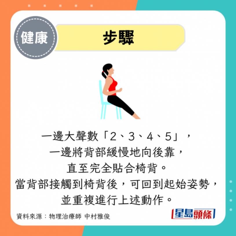 - 一邊大聲數「2、3、4、5」,一邊將背部緩慢地向後靠,直至完全貼合椅背。當背部接觸到椅背後,即可回到起始姿勢,並重複進行上述動作。