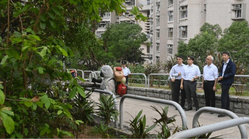 黃大仙鳳德邨昨日(26日)錄得本港首宗基孔肯雅熱本地感染個案,政府各部門加強防蚊控蚊工作。環境及生態局局長謝展寰今午(27日)在食環署署長吳文傑及相關部門代表陪同下,前往鳳德邨及附近一帶,視察地區加強預防基孔肯雅熱的工作。